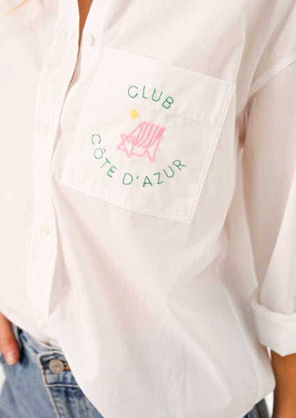 Chemise manches longues blanche avec broderie cote d'azur sur la poche.