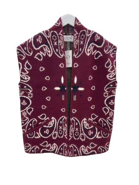 Gilet sans manches bordeaux imprimé bandana de la marque Orlinn. Pas de fermeture. 40% Viscose, 30% Polyamide, 20% Wool, 10% Cachemire