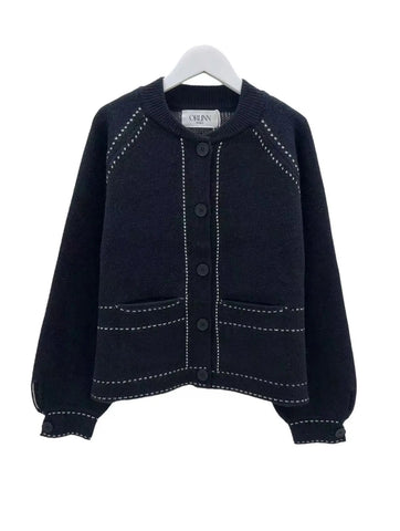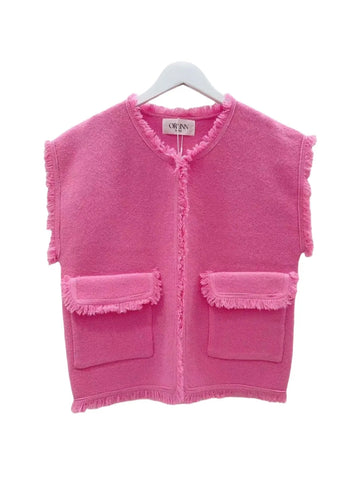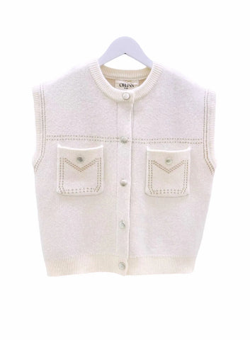 Gilet sans manches à boutons de la marque Orlinn avec surpiqûres contrastées. Taille unique. 40% Viscose, 30% Polyamide, 20% laine, 10% Cachemire